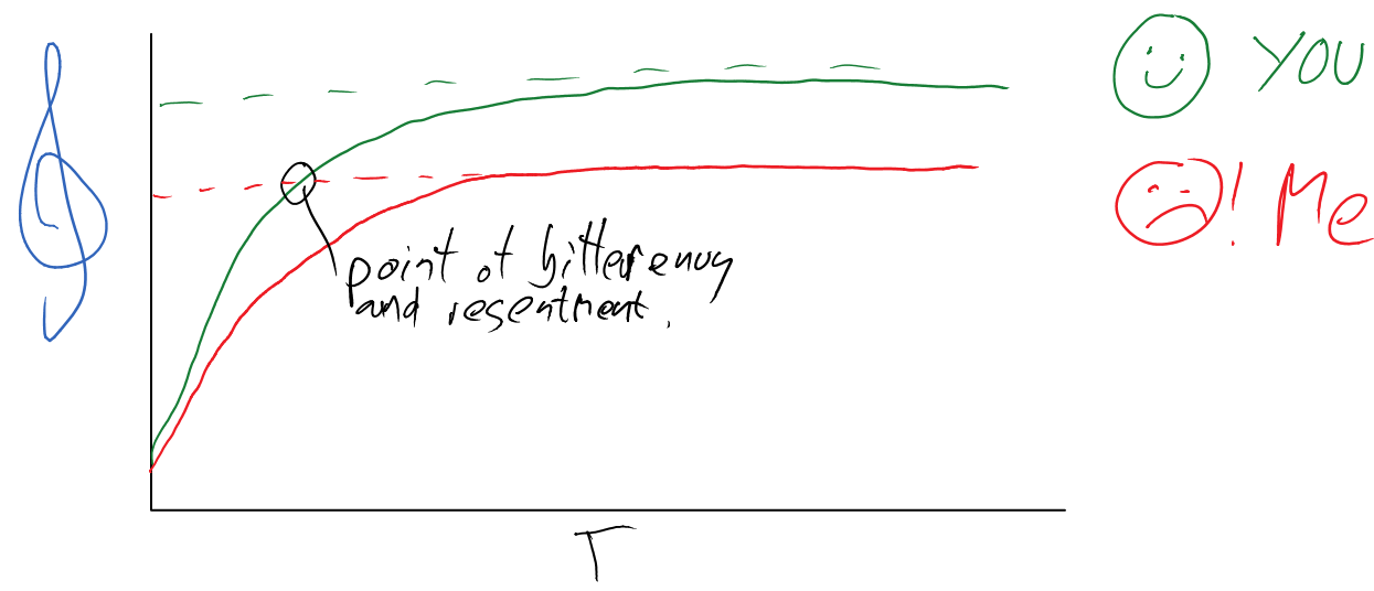 On this model my future as a violinist shows fairly clearly diminishing returns. I start with dramatic improvements as I spend time practising, even if I continue practicing steadily my rate of growth levels off: getting from ‘novice’ to ‘pretty good’ may be much easier than getting from ‘pretty good’ to ‘world leading’:[ref]Where relative abilities lie on a cardinal scale is fuel for all sorts of interesting conjecture: is a world leading violinist actually that much better, in objective terms, than someone filling half a desk at a local orchestra? How might it vary by field? Are some ‘easy to master’, and beyond a certain point everyone lies on a par, or might some have a convex relationship?[/ref]