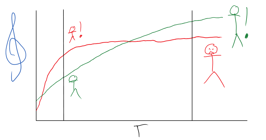 The other key wrinkle is that because of the concave function relating to practice, differences in talent become more important than differences in practice when you have a lot of practice: 11000 units of practice is only 1% better than 10000 units of practice, and so could be swamped by modest differences in ability. Even a fixed multiplier on the amount of practice gets significantly less important as lots of practice is accrued. If we both put in the allegedly requisite 10000 hours of practice to master the violin, and I practice twice as effectively as you, my (effectively) 20000 hours only gives me a <10% advantage over your 10000 hours – putting human ability on a cardinal scale is difficult, but plausibly talent may vary by significantly more than that. If there’s a ceiling effect to practice, then this feature becomes even more marked – effectively our talent sets an envelope of our abilities, and so no amount of increased practice on my part can compensate for your greater talent with a sufficient amount of practice:
